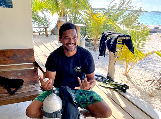 Originally from Tikehau, with a big heart, Kaharani, nicknamed «Kalash», will show you the lagoon and the pass with great passion. He will accompany you and ensure your safety on the boat, very attentive to your needs, you are in good hands.